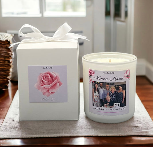 Photo Memorial Candle KeepsakeThis beautiful photo memorial candle of a loved one serves as a heartfelt tribute and comforting remembrance. This candle is a thoughtful gift for someone who is grieving, Keep their light alive with this touching keepsake. STANDARD TEXT:Your life was a blessing and your memory a treasure. You are loved beyond words and missed beyond measure. HOW TO ORDER:1. Email a high-quality photo, along with the name you wish to appear on the candle to: candlesbymj@outlook.com 2. We will create your label and send you a draft to approve (2 free revisions available) Each candle comes packaged elegantly in a sleek...